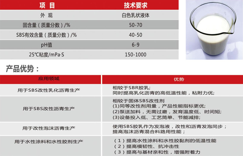 乳狀液體SBS,具有良好的儲存穩定性和流動性,用于SBS改性乳化瀝青、SBS改性瀝青、SBS改性泡沫瀝青、水性涂料和水性粘合劑的生產。